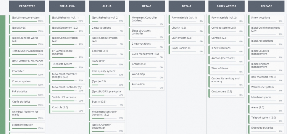There're two views for Reign of Guilds roadmap: by status and by stage. The first one shows the content and the features developed by its status. The second one shows the content and features to be developed and implemented at every stage.
